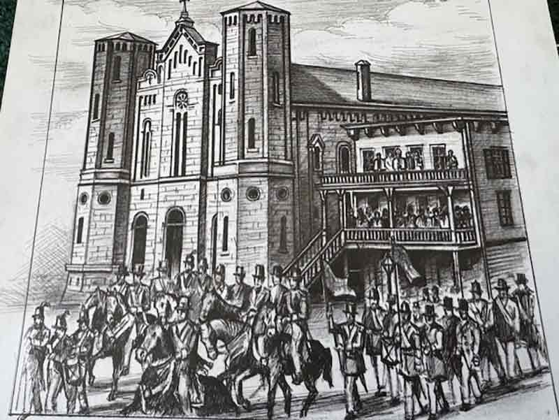 The Grand marshals and their aids pranced around on great steeds with high green plumes attempting to organize the large number of marchers from numerous organizations. A squad of police represented all three divisions of the city led the parade and cleared the way. In addition, a procession of clergy led by two Bishops in gold vestments, numerous priests and deacons, along with close to 100 nuns and Sisters of Charity in their habits, added to the solemn but colorful ceremony. The Second Regiment appeared publicly for the first time in full regimentals, generating thunderous cheers at their colorful and professional appearance.
