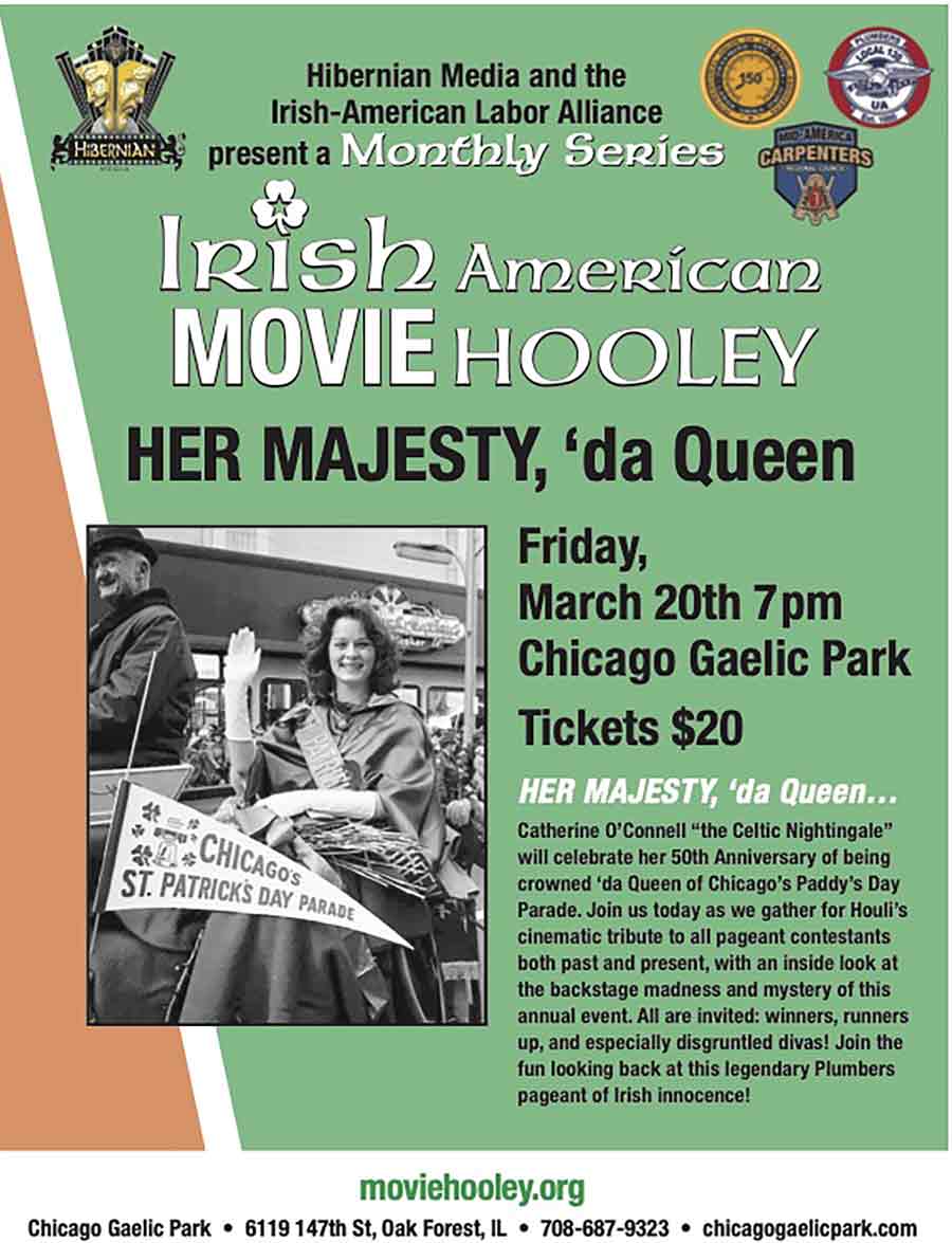 In celebration of Catherine O’Connell’s 50th Anniversary of being crowned Queen of Chicago’s St. Patrick’s Day Parade Hibernian Media presents a special screening of Mike Houlihan’s hit comic documentary HER MAJESTY’ ‘DA QUEEN on Friday March 20th at 7PM at Gaelic Park. This film has screened previously on WTTW Channel 11 in Chicago and audiences love sharing in all the drama, excitement and hilarity that comes with each Queen contest. Former Queen Elyse Lyons specifically requested this screening as part of our Monthly Movie Hooley at Gaelic Park and we have responded! Many former Queens and contestants will be in attendance and we invite YOU to join them in the audience that night on Friday March 20th