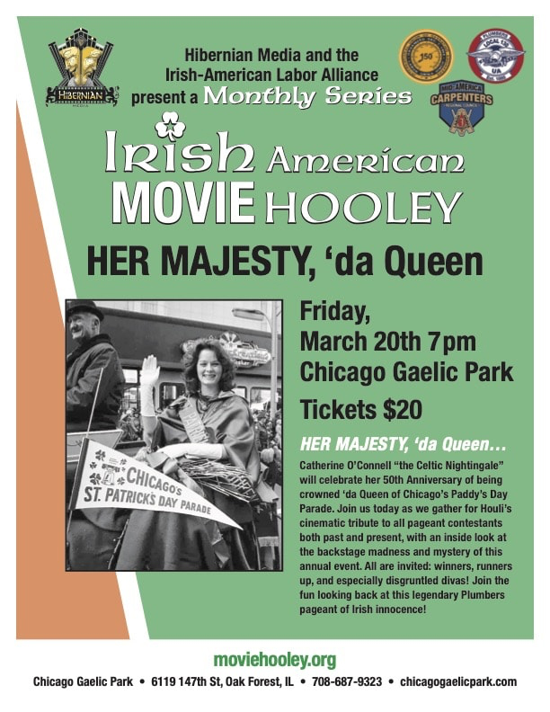 Join us this Friday night at Chicago Gaelic Park as we celebrate Chicago treasure and singer Catherine O'Connell's 50th Anniversary of being Queen of Chicago's St. Patrick's Day Parade. We will be honoring her with a special film screening of our 2009 film Her Majesty, 'da Queen. Many parade Queens past and present will be joining us to honor Catherine on this special night.