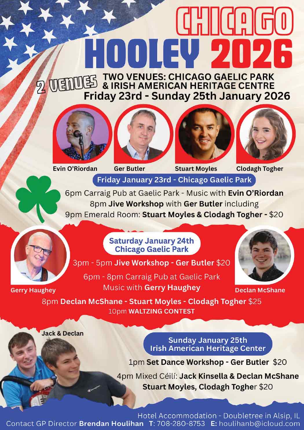Chicago Hooley 2026 is set to energize the Windy City January 23rd -25th with a full slate of Irish music and social dance. This exciting collaboration between Chicago Gaelic Park and the Irish American Heritage Center promises a weekend of top entertainment and welcoming community!