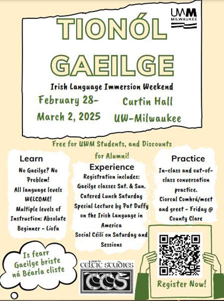 Irish language classes for all levels, absolute beginner to líofa, from teachers from Ireland. Evening socializing and conversation, music, song, and more for everyone at the Hotel County Clare (1234 N. Astor Street, Milwaukee, group rate $120/night + taxes). There will be a strong Chicago contingent at this event. Join us!